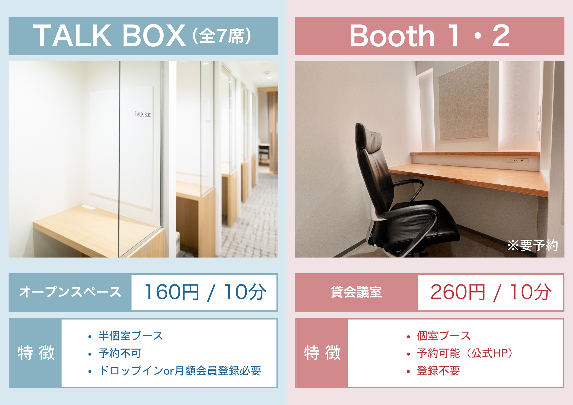 当館には、予約不要で使える半個室の「TALK BOX」と、事前予約して使える個室(会議室)の「Booth」がございます。